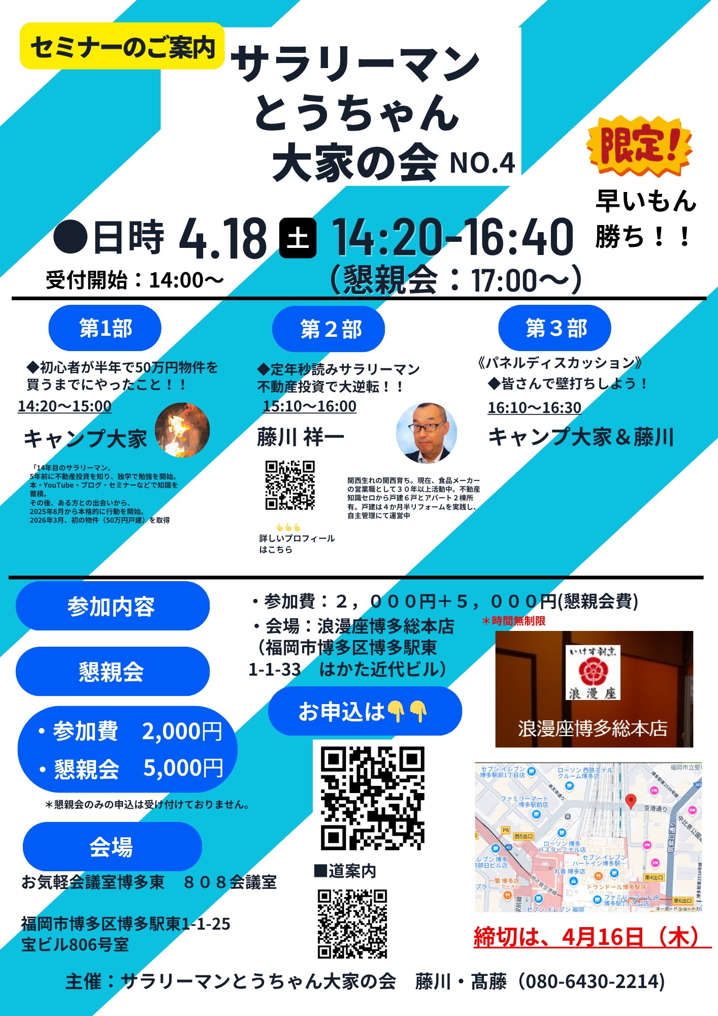 | セミナー会場 | お気軽会議室博多東 808会議室 福岡市博多区博多駅東1-1-25 宝ビル806号室 |